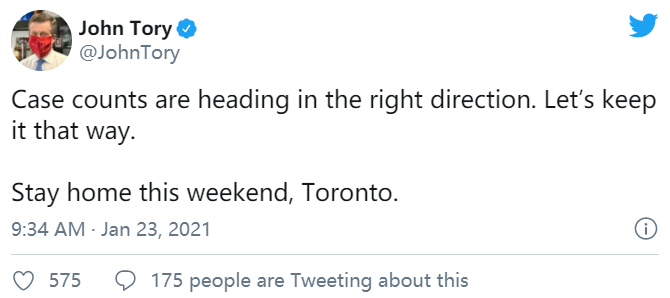 多伦多市长庄德利也发推称,“确诊病例正在朝着“正确的方向”发展。”
