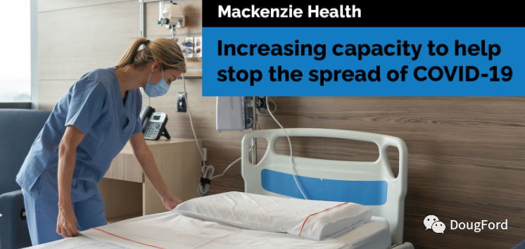 福特省长在近日记者会上指出:安省政府已拨款1.25亿元,立即为本省重灾区医院新添超过500张重症监护和高强度医疗床位。其中,一部分资金将用于协助Mackenzie Health旗下的旺市医院(Cortellucci Vaughan Hospital)临时转型,从而帮助省府应对疫情。该家医院将于2021年2月7日开张。鉴于邻近地区住院率和重症监护室占有率上涨,省府此举可为附近医院减缓压力。