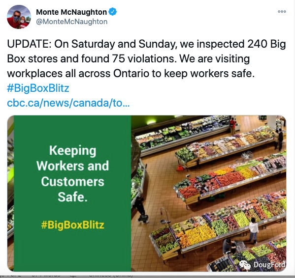 劳工厅长在推特上表示:“在上周六和周日,我们督查人员已经访察了240家大卖场,并发现有75家违例。我们将访察全省各地工作场所,来确保劳工安全。”