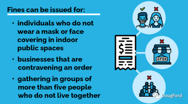 紧急状态生效后,所有执法人员皆有权开罚单,当中包括安省警察、地方警察、附例执法人员、省府工作场所检查人员。执法人员如果发现民众不遵从宅家令,或在室内不佩戴口罩,又或发现企业、零售店不遵从抗疫指令,可以开出罚单。如果被发现违反规定,执法人员可根据《重启安省法案:灵活应对疫情》(Reopening Ontario “A Flexible Response to COVID-19” Act)和《紧急管理及民事法案》(EMCPA)收取罚款。