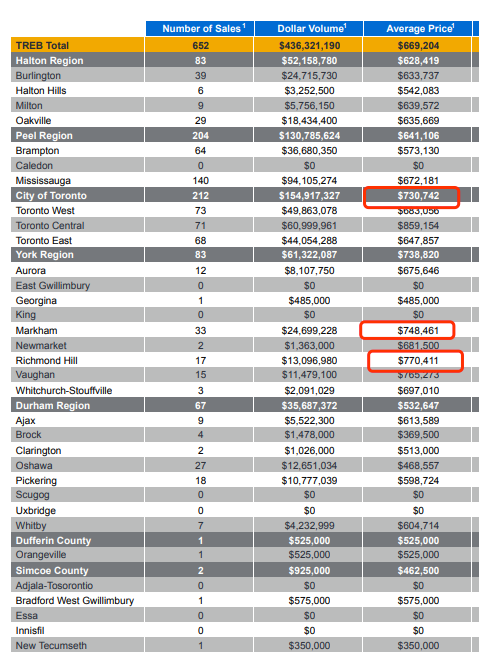 公寓condo方面,多伦多均价73万,万锦74万,列治文山77万。