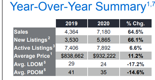 地产局表示,由于大流行影响,楼市在2020年春季急剧下降之后,下半年开始起飞。2020年全年,大多伦多地区售出的房屋总数为95,151套,比2019年全年(87,751套)增长了8.4%,是有记录以来的第三高的年份。2020年大多伦多地区所售出95151套房屋的平均售价为$929,699加元,较2019年($819,279加元)增长了13.5%。2020年12月的月报,大多伦多地区房屋销售飙升至7,180,比2019年12月(4,364)爆涨近65%。
