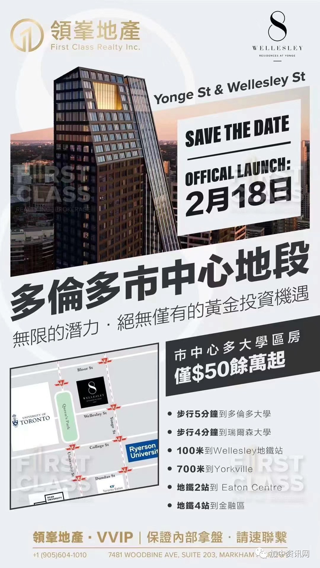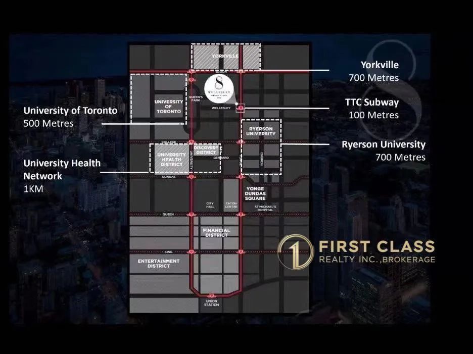 2021年公寓投资风向标!8 Wellesley公寓位于多伦多市中心Yonge & Wellesley交叉口,DT核心地带,紧邻世界最长的城市街道Yonge street,集合了中心商务、金融、娱乐、购物、餐厅等各种公共设施和资源。此公寓为混合用途高层公寓建筑,底楼5层裙楼加上50层住宅楼层。