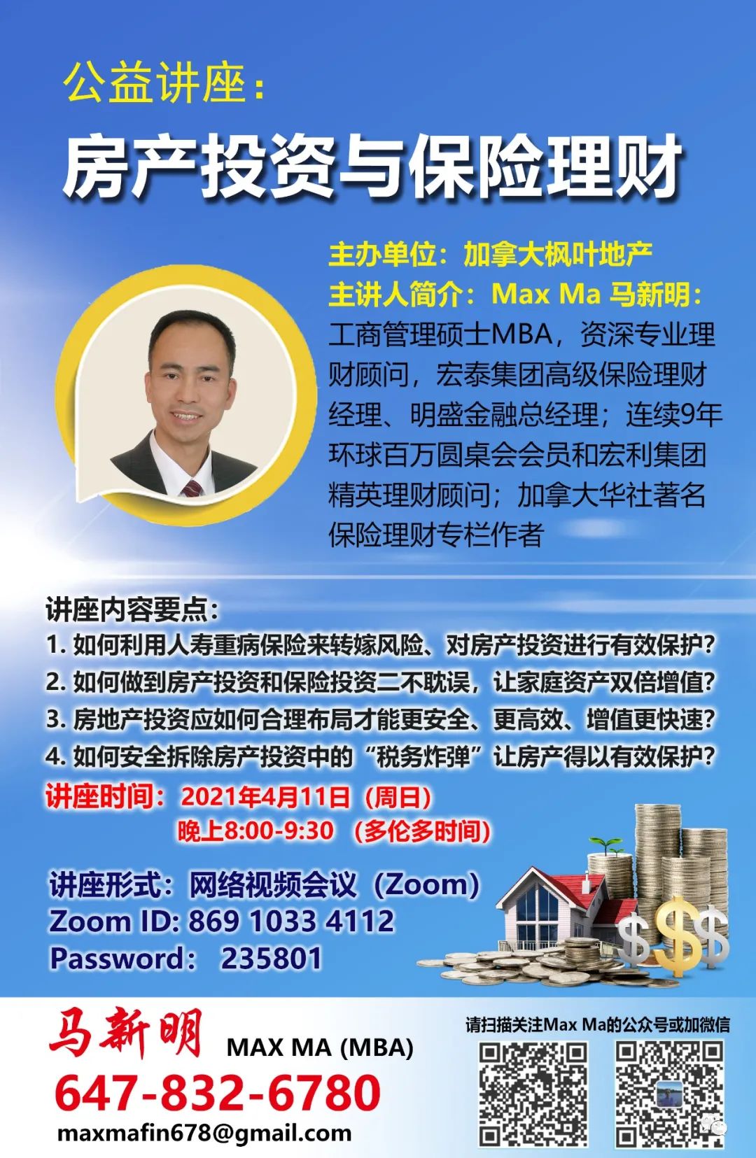 作为房产投资人,如果您对房产投资和保险理财感兴趣,那么就请您一定不要错过周日(4月11日)晚上由加拿大枫叶地产举办的的公益讲座.,来听一听特邀主讲嘉宾Max Ma作为一名资深专业理财顾问(同时也是一名成功的房产投资人)的切身体会和精彩分享!