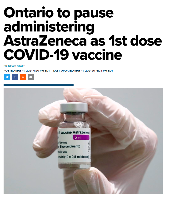 加拿大安省卫生官5月11日宣布,由于人们越来越担心这类疫苗与血栓之间的关联性,安省将停止将阿斯利康作为第一剂新冠疫苗为居民接种。