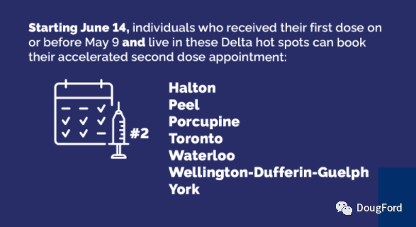 省府为保护Delta变种肆虐最严重社区民众,和为阻止病毒传播,决定向更多人群开放第二剂疫苗预约。自2021年6月14日星期一8时起,如果民众位于荷顿区、皮尔区、Porcupine、多伦多、滑铁卢、约克区、Wellington-Dufferin-Guelph,并已于2021年5月9日或之前接种第一剂mRNA疫苗,将有资格提前预约第二剂疫苗。民众可以在中央系统上预约第二剂,或联系指定药店。如果当地不使用中央系统,亦可以直接联系当地公共卫生局。基础护理机构亦将主动联络民众,来完成疫苗预约。