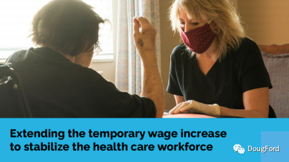 省府拨款1.41亿元,延长临时涨薪措施有效期,受惠对象为公立家庭和社区护理机构、长期护理院、公立医院、社会服务机构工作个人看护员(PSW)和身心障碍看护者(direct support workers)。省府将涨薪政策延长至2021年8月23日,而此举有助稳定护理队伍,并招募和留住更多人手,尤其是疫情期间。