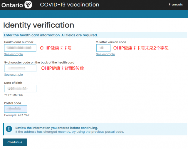 2.点击“get results”后,按要求填写OHIP健康卡信息、出生年月日和住址邮编: