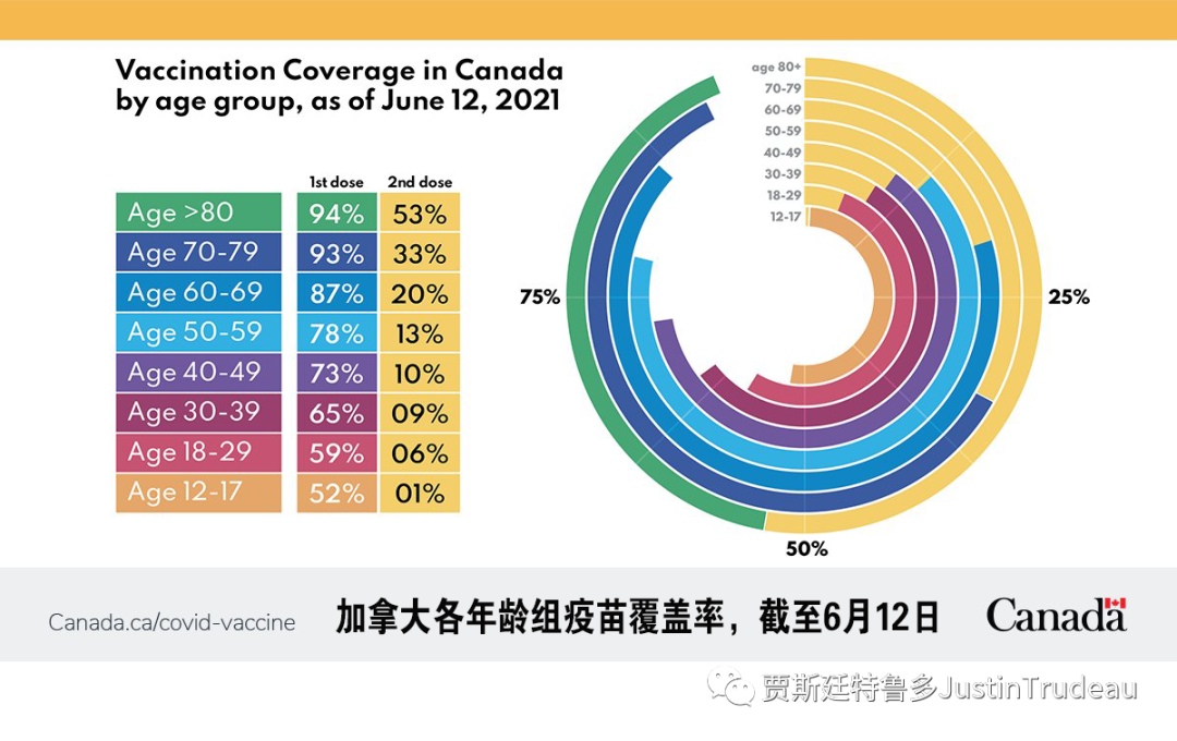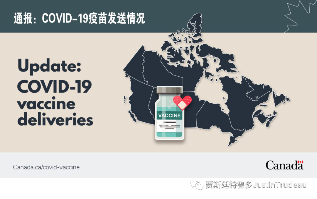 随着我们继续分送这些疫苗到全国各地,并做好准备迎接更多的疫苗之时,我们将继续努力工作,让您自己、您的父母、您的朋友和您的邻居能够尽快接种疫苗,目前已有近75%符合条件的加拿大人至少打了一针疫苗。因为每打一针疫苗,都能守护一个人的安全,每打一针疫苗,都离结束这场疫情大流行更近一步。