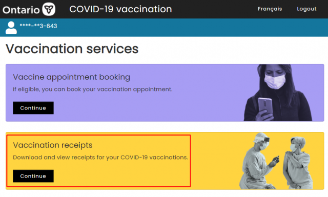3 点击“continue”登录成功后,可以看到有两项服务,第一项是疫苗预约,第二项就是我们要找的疫苗接种凭证下载: