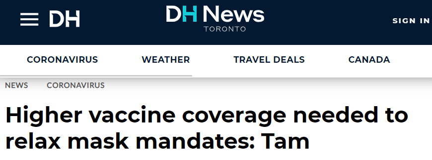 加拿大首席卫生官谭咏诗博士表示:不会放弃强制口罩禁令!由于加拿大还没有针对Delta病毒实现足够广泛的疫苗接种,强制戴口罩的防疫政策会继续执行。