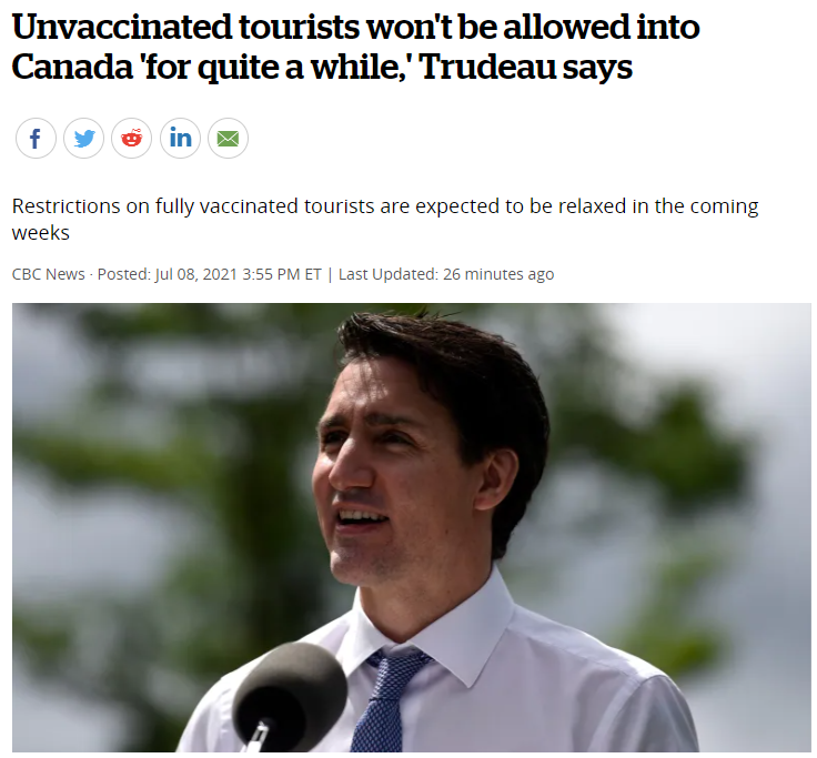 特鲁多总理7月8日在卑诗省高贵林市举行的一场新闻发布会上,在回答记者关于旅游业何时重启,以及那些接种或没有接种疫苗的游客什么时候能入境时,特鲁多说:“我现在可以告诉你,这种情况在很长一段时间里都不会发生。”
