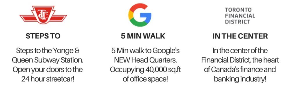 「Queen Central」地处繁华,靠近多伦多大学、多伦多金融核心区、PATH地下商城、Distillery District、Financial District、Cabbagetown、高速公路、便利店、超级市场、医院以及公园等,距离Google谷歌加拿大新总部只有600米。