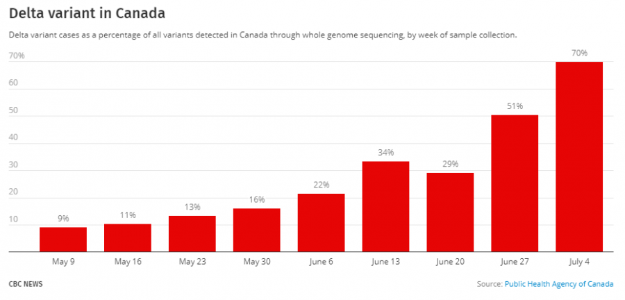 根据加拿大公共卫生局最近的基因组测序数据,到七月初,Delta变种病毒病例占加拿大病例的约70%。这与五月初相比有大幅上升,当时Delta仅占病例的9%。
