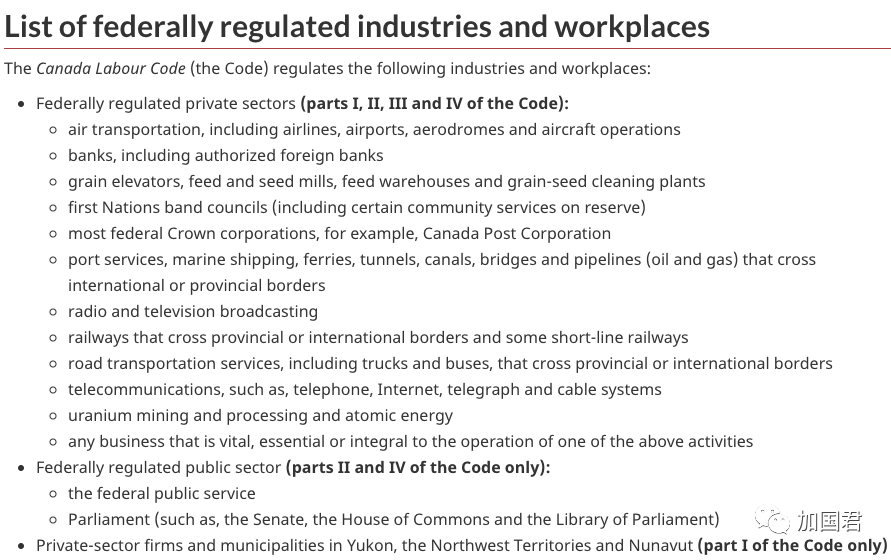 根据联邦政府官网提供的信息,联邦规管的行业分以下三大类共15个行业: