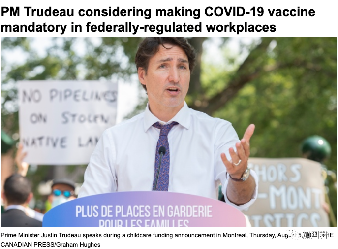 加拿大总理特鲁多8月5日首次表示支持强制疫苗方案,考虑强制要求所有联邦雇员接种 COVID-19 疫苗。包括受联邦监管的行业,例如机场、银行、邮局等等。