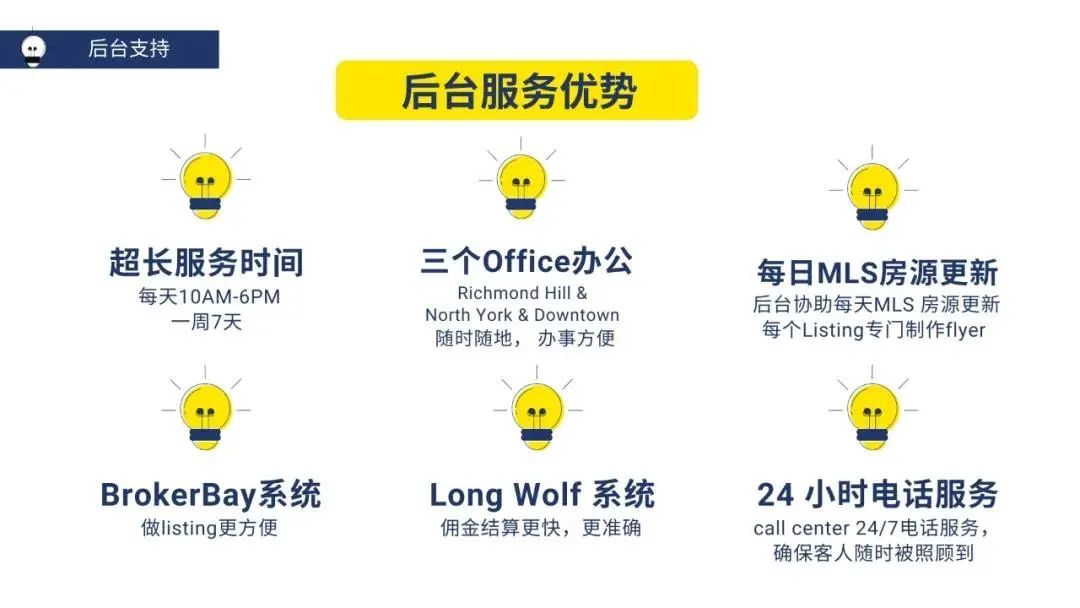 《我爱我家》拥有市场最前沿的前后台服务系统,保证经纪在做单过程中,有24/7的人工后台服务系统,其中包括即时对接房源状态和高效与同行沟通的Brokerbay定房系统,和Lone Wolf后台跟单系统,保证公司可以在成单后,第一分钟与经纪结算佣金等。