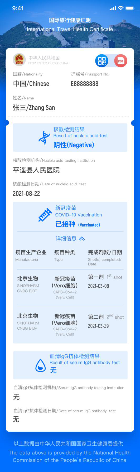 第三步:认证通过后,生成载有核酸及血清IgG抗体检测结果、新冠疫苗接种记录的国际旅行健康证明。点击右上角图标可下载打印PDF版本。