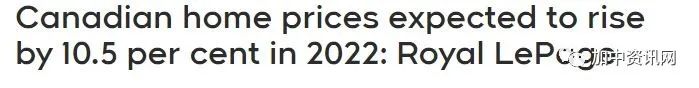 12月15日,加拿大皇家地产公司Royal LePage公布2022年房市预测报告,报告预计,在2022年,加拿大全国平均房价将上涨10.5%,其中多伦多、温哥华和哈利法克斯的涨幅最大。