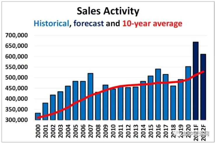 塔尔表示,受新移民流入增加的影响,预计在未来几个季度,每月的销售活动接近5.5万次,甚至可能更高,然后在2022年下半年房市活动放缓。预计到2022年年末,房市的表现将类似于2019年年末。