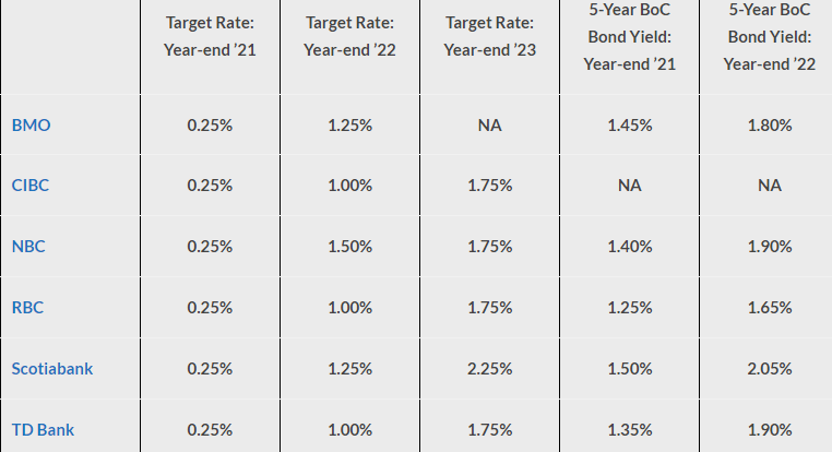 根据6家大银行的预测,到2022年底,央行的隔夜利率会上调到1%,到2023年底,继续上调到1.75%。