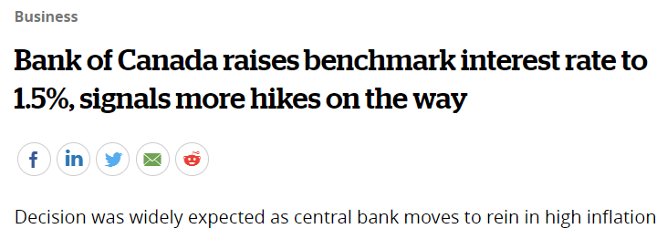 加中资讯网2022年6月4日讯,6月1日,加拿大央行将基准利率上调至1.5%,并暗示即将进一步加息。