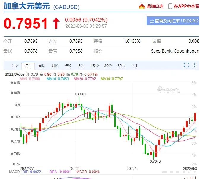 另外一边,加元兑美元也涨至一个多月来的高点,今天的汇率最高涨到0.7951,即每1美元能兑换1.2572加元。