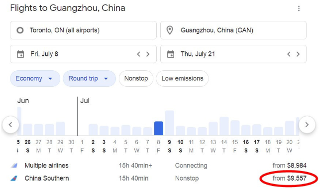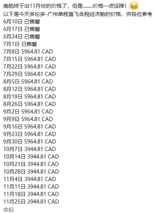 据一位华人旅行社人士发微信朋友圈显示,多伦多至广州的直达航班从现在到7月1日机票均已售罄,7月8日以后有票,票价$5964起。直到10月14日机票才有所下降,达到$3944元。而最新出炉的11月票价,没有继续下降。