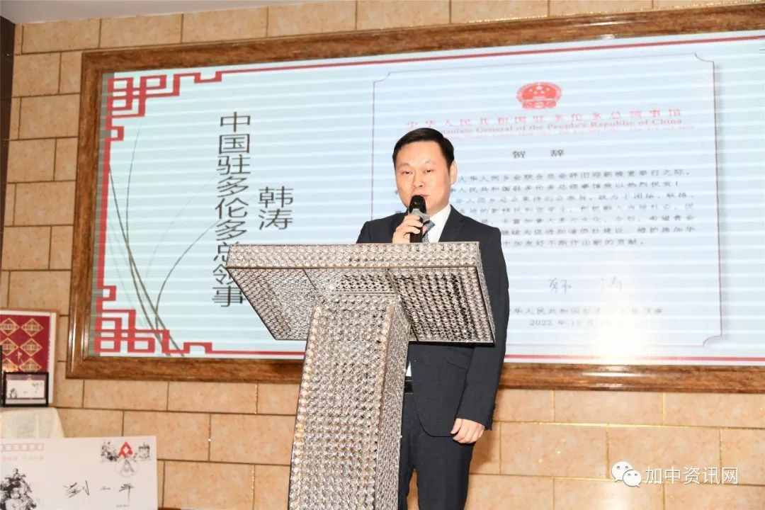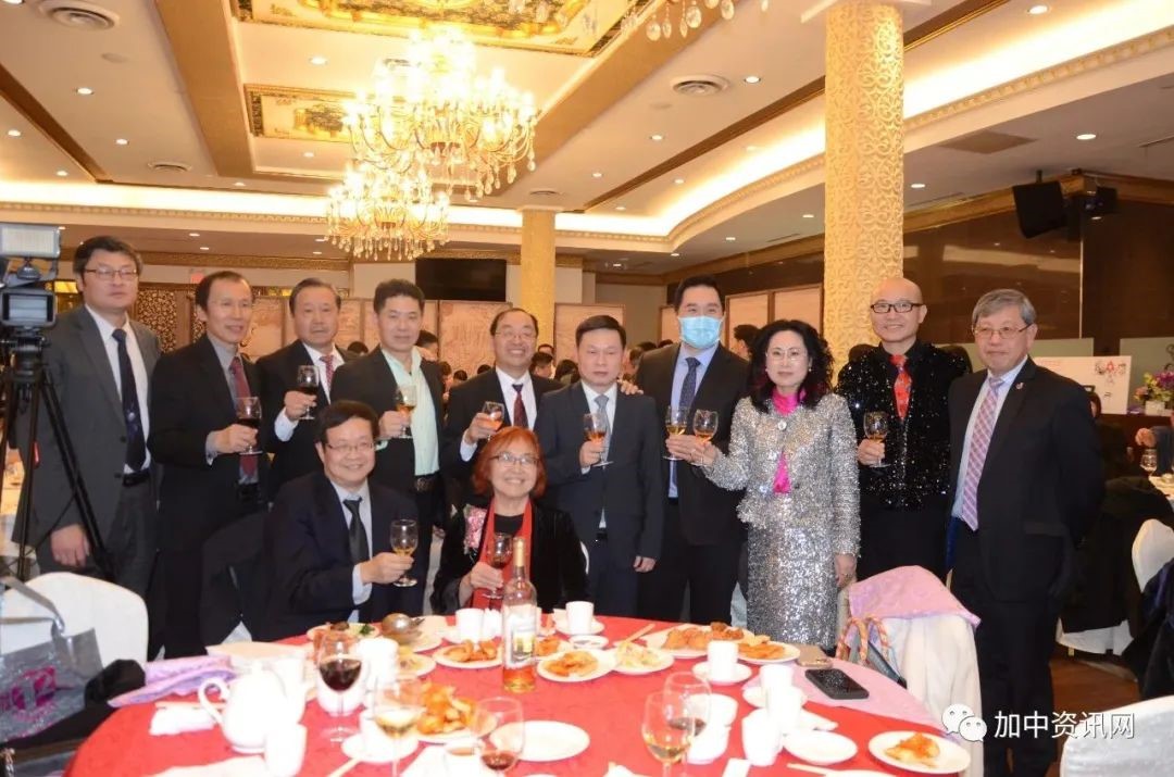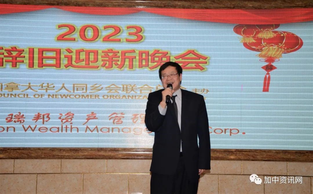 中国驻多伦多总领事馆程洪波副总领事在致辞中:“我谨代表中华人民共和国驻多伦多总领事馆致以热烈祝贺加拿大华人同乡会联合总会辞旧迎新晚会隆重举行。