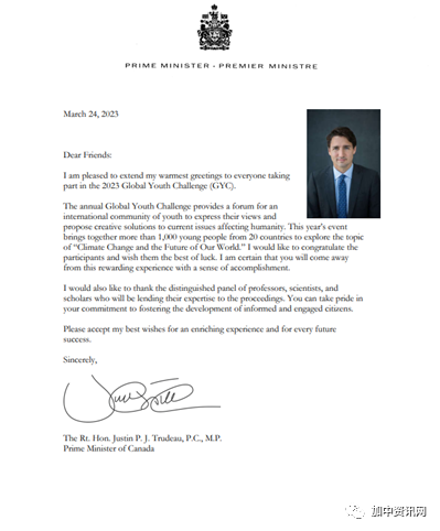 加拿大总理特鲁多向比赛发来贺信,他对这个比赛给予赞赏,特鲁多表示,对于参赛者来说,这个比赛无疑是一个有益的收获,他还感谢担任评委的著名教授学者们,能把自己的知识和经验传授给青少年。