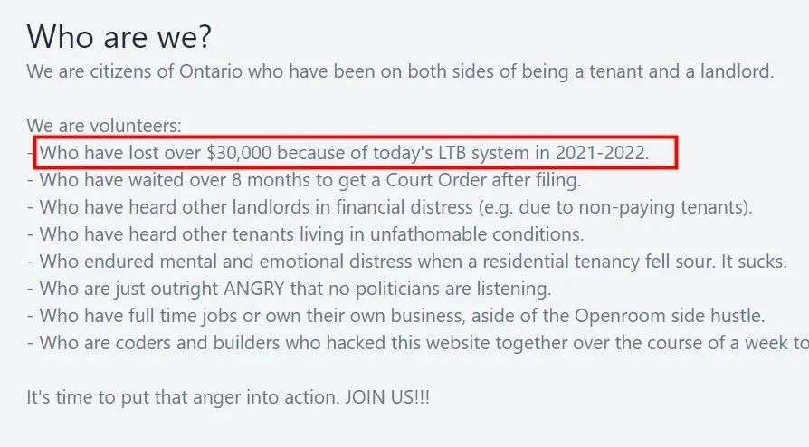 网站创立者说,我们是安省的公民,既是房客又是房东。我们是一群志愿者:包括那些在2021-2022 年,由于LTB系统导致个人损失超过30,000元、提交申请后等待8个月以上才获得法院命令、由于租户不付款陷入财务困境的房东和被房东压榨的租客。