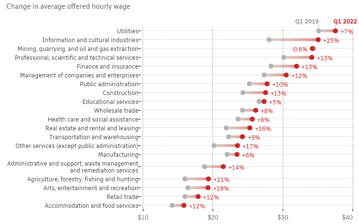 如上图所示,在劳动力市场紧张的情况下,某些行业(例如技术和信息服务)的时薪大幅增加。