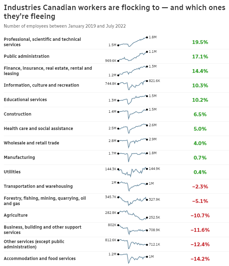 上图显示了工人向公共行政和房地产,以及食品服务等部门的巨大转变。麦吉尔大学的劳工经济学家Fabian Lange说,似乎许多工人正在向薪酬和福利更好的行业涌入。