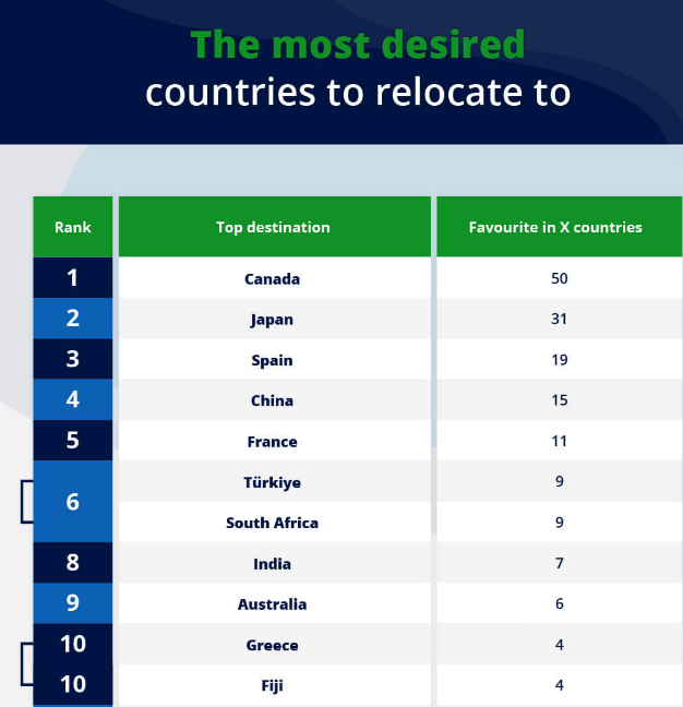 另一方面,加拿大人显然也很有兴趣搬到其他地方。在排行榜上位居第二名的日本也是不少加拿大人想要搬去的国家。