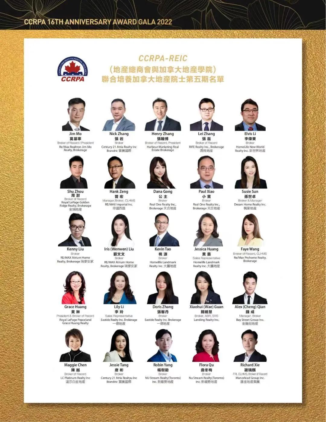 获得2021年度CCRPA顶尖经纪奖励的分别是:鸿利地产David Zhu、Michael Sun,金融街地产Wayne Xu、Vicky Zhou、Nico Lin,联合地产Leo Jin,21世纪美联地产Lee Li、Gail Yu,Cornerstone Marketing Realty Inc. Andy Lam,枫叶地产Alina Yang,一德地产William Wei,领峯地产Simon Peng,博域地产集团Martin Wu,恒艺地产Louis Huang,创富地产Roy Sun,大鹏地产Vicky Si Yu、Vincent Jiang、Jason W. Wang、Hannah Han、Michael Mao,国坤达地产Jack Jiang,新世界地产Janice Xu、Karen Zhang、Kena Li,嘉德置业Sandy Liu、Hugh Liao,ReMax Realtron William Zhou、Jason Gao,家欢地产Yanpan Zhao,卓安特地产Eva(Yihua) Yang,加华置业Sam Xing,加中置业Lynn Shao,新趋势地产Rhino Zhai、Nelson Zhao,瑞泰地产集团Elvis Ge,天合地产Cherry Yang、Harry Luo、Peter Feng,瑞麦安家地产Ken Chen,帝国地产Yin Yao,润飞地产Helen Zhang,精英置业Rose Liu,金瑞地产Matthew Yan,君安地产Allan Luo,地王地产Rick Qiu、Oscar Wu,超越地产Rachel Wang,我爱我家John Gao。