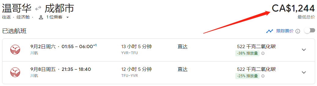 如果在9月2日温哥华-成都,并在9月8日成都-温哥华,往返票价总计仅为1244加元。