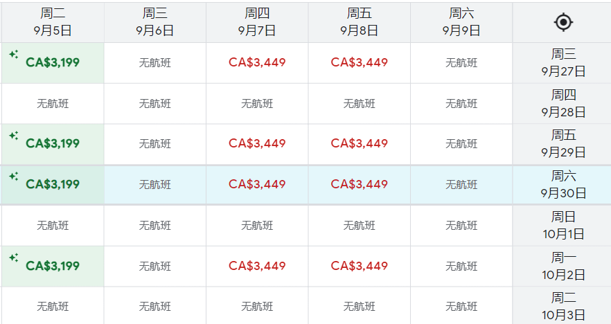 9月5日温哥华出发,9月底上海返回的往返机票,也要$3199。