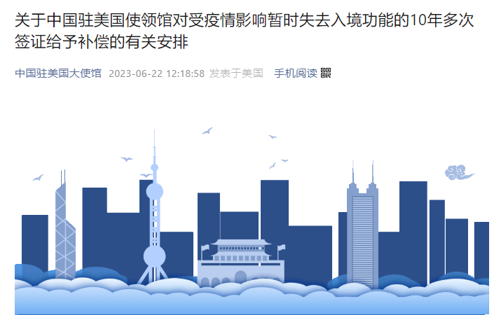 加中资讯网2023年6月23日讯 6月22日中午,中国驻美国大使馆官方公众号发布通知《关于中国驻美国使领馆对受疫情影响暂时失去入境功能的10年多次签证给予补偿的有关安排》,将对受疫情影响暂时失去入境功能的10年多次签证给予补偿。