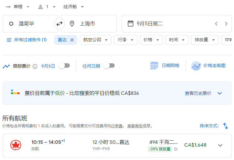9月5日温哥华-上海单程就需要$1648加元,比此前的往返还要贵一些。