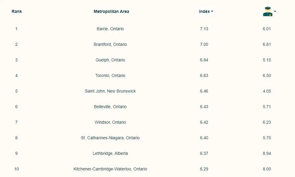 加中资讯网2023年7月6日讯 最新加拿大城市安全居住数据公布,排名第一的是Barrie,多伦多排名第四。城市安全排名垫底的是Winnipeg。