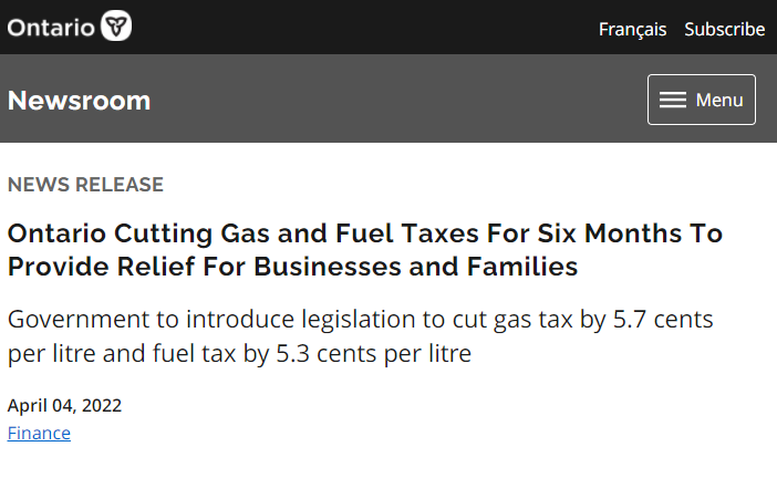 加中资讯网2022年4月7日讯 根据安省政府官网消息,作为降低安省家庭和企业生活成本计划的一部分,安省政府正在制定立法,如果获得通过,每升汽油税(Gas Tax)将降低5.7分,燃油税(Fuel Tax)将每升降低5.3分。