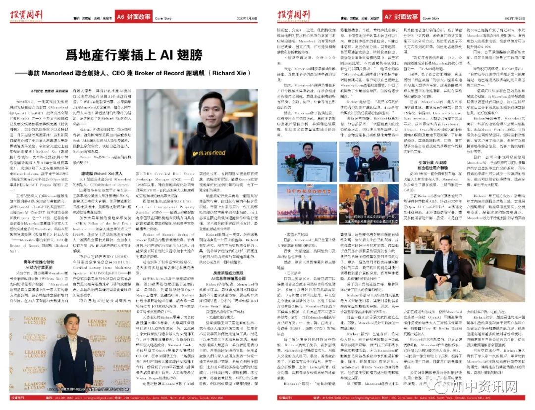 记者很想深入了解Richard团队是如何做到将AI与房地产行业相结合,赢得OpenAI ChatGPT的高度认可,且被OpenAI ChatGPT 批准成为全球首批Plugins 之一?日前,记者有幸造访汇金Manorlead集团旗下这家人工智能房地产公司Manorlead,采访本期枫华传媒集团《投资周刊》封面人物“——Manorlead联合创始人、CEO兼Broker of Record 谢瑞麒(Richard Xie)。