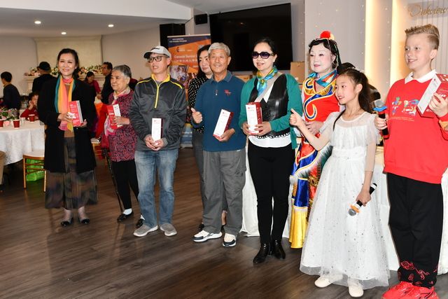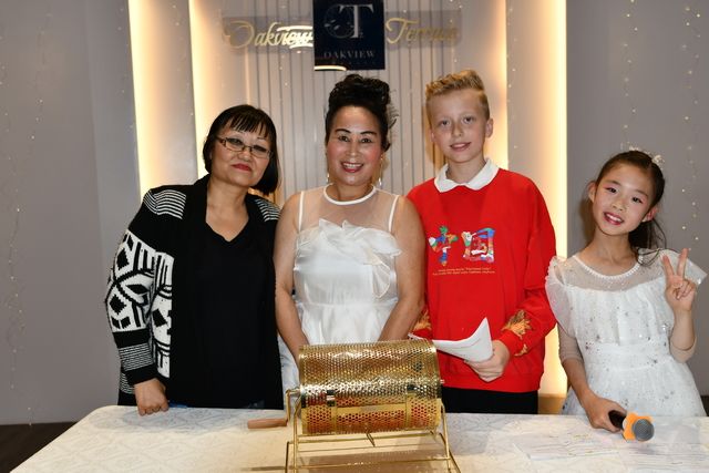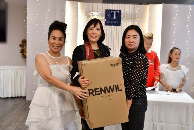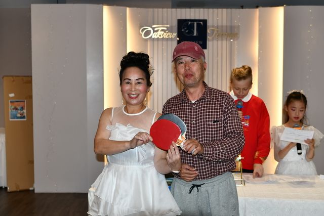 在丰盛的晚餐后,活动进入了期待已久的抽奖环节。奖品包括由方太提供的精美水杯、VIVA提供的价值$60礼品卡和乒乓球拍等,丰富的奖品引发了参与者的热烈反应。每一次抽奖都伴随着欢呼声与期待,获奖者们满脸笑容地上台领奖,与颁奖嘉宾合影留念,留下了美好的回忆。