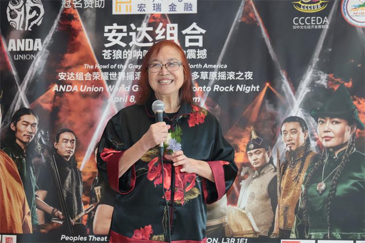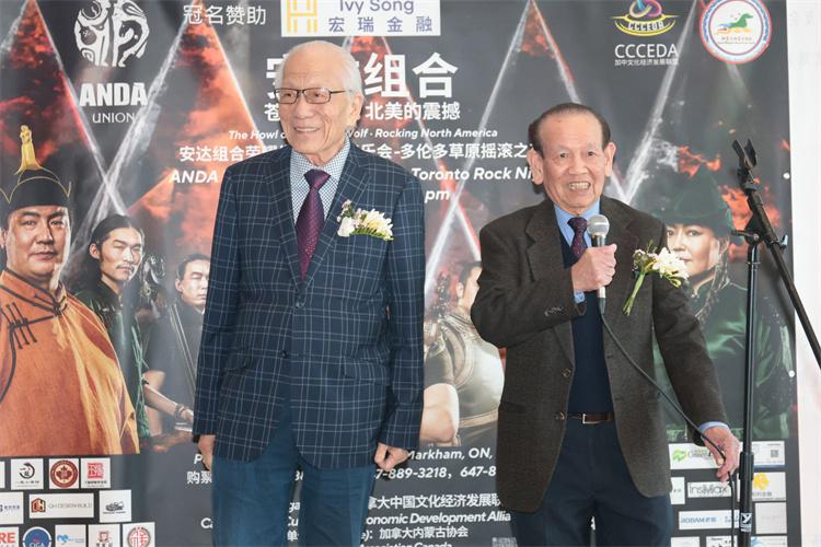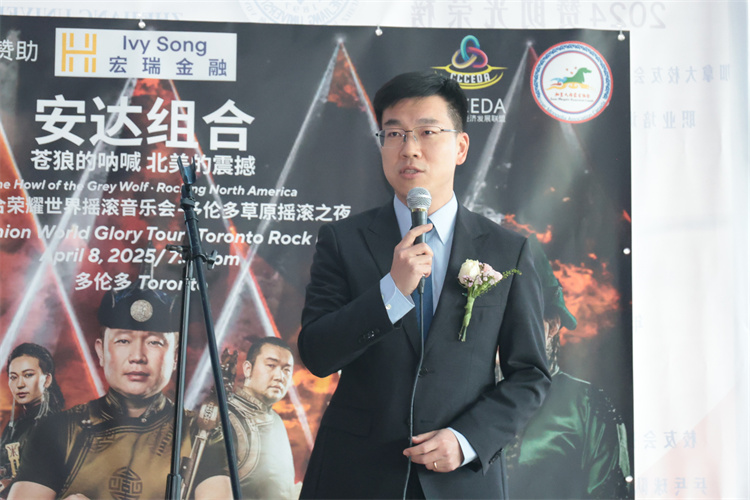 他衷心感谢演出的主办方,感谢Sophia lian主席和发展联盟多年来为中加文化交流作出的卓越贡献,感谢所有相关人员的辛勤付出。他说当前无论是中国,还是加拿大,都正承受着巨大的关税压力,面临着前所未有的挑战,这个时刻,正能量的音乐作品能够振奋人心。特别是安达组合的名字,安达的意思是结拜兄弟。大家团结一致,开放合作才是历史潮流,互利共赢方为人间正道。最后,让我们一起酒喝干,再斟满,尽情享受这精彩的草原摇滚之夜。