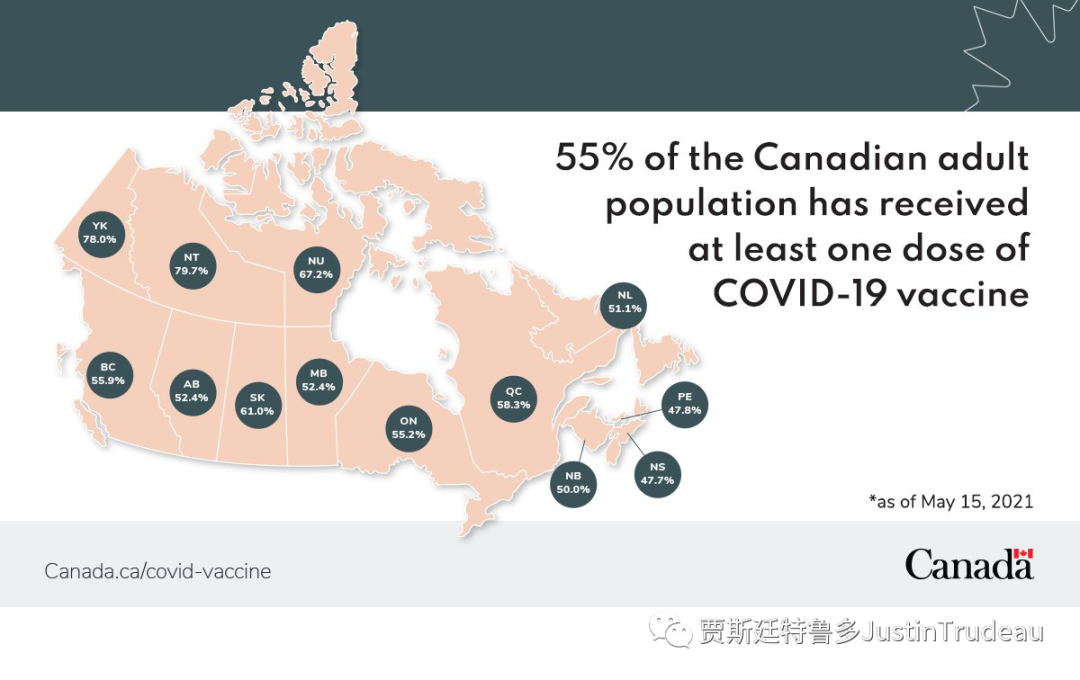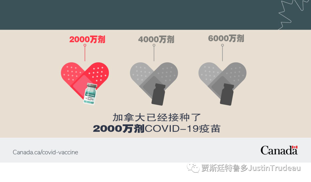 特鲁多总理最新通报:“截至5月21日,加拿大各地接种COVID-19疫苗的数量已经达到2000万剂。对所有帮助推动这一结果成为现实的人们,不论是奋战在前线为民众打疫苗的人员,还是卷起袖子接种疫苗的人们:感谢你们。”