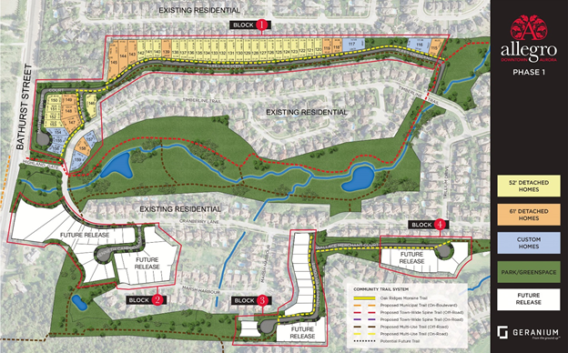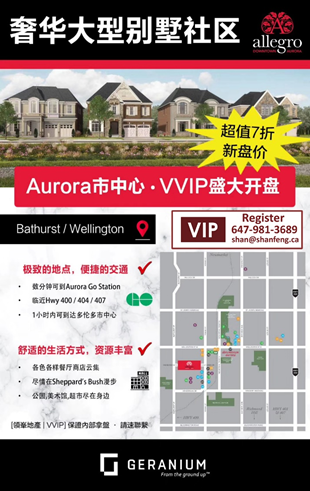 Allegro 位于Bathurst和Wellington的交界 ,在Wellington的南边,在Aurora的市中心的旁边,总之就是好的不行的位置,极致的地段,交通便利快捷,临近高速400,404和407,还有Aurora Go车站就在附近,一个小时之内可到达多伦多市中心!
