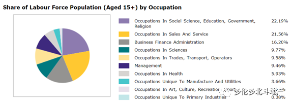 根据多伦多地产局的社区人口数据,Taunton社区的居民平均家庭收入为123,719加元。人口比较多元化,主要由英裔为主,母语为英语的居民占比83%,印度、葡萄牙、法国、意大利、菲律宾、阿拉伯、中国、伊朗等各个民族的人口都有。在劳动力方面,从事科技、教育、政府、销售和服务、财经等专业工作的人员高达60%以上(详见以下图表)。总体来说,这个社区的人口密度较低,是一个多文化多民族和谐共处的高素质社区。