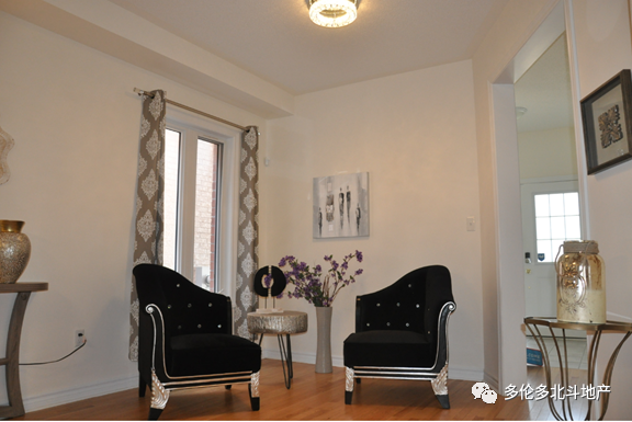 带有壁炉的Family Room,开放式格局和对着后院的大玻璃窗,再加上整个一楼的9尺层高,让整个空间显得非常透亮,而且木质的地板也是很多家庭所喜欢的橡木色系。