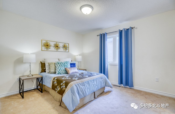 这栋别墅二楼共有5 间卧室,这在Taunton社区的市场上还是不多见的。主卧是个双开门的房间,面积非常大,五件套独立卫生间,两个步入式的衣帽间。多扇玻璃窗让主卧宽敞明亮,阳光洒满床头。