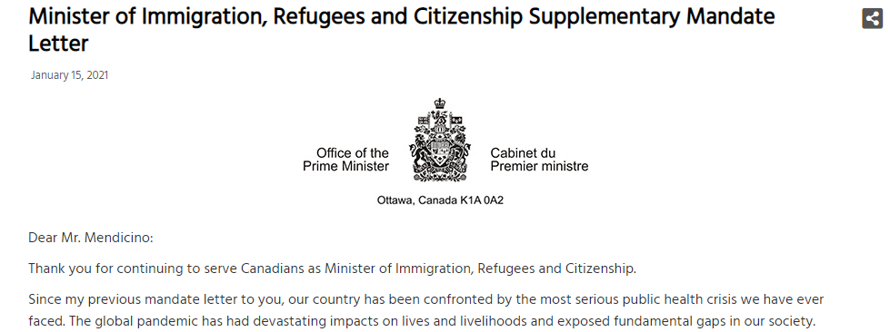 新的授权书对2019年12月发布的原授权书进行了补充,新的补充授权书定义了一些关键问题,包括加拿大移民水平计划、改善移民部的申请处理时间,以及其他问题。